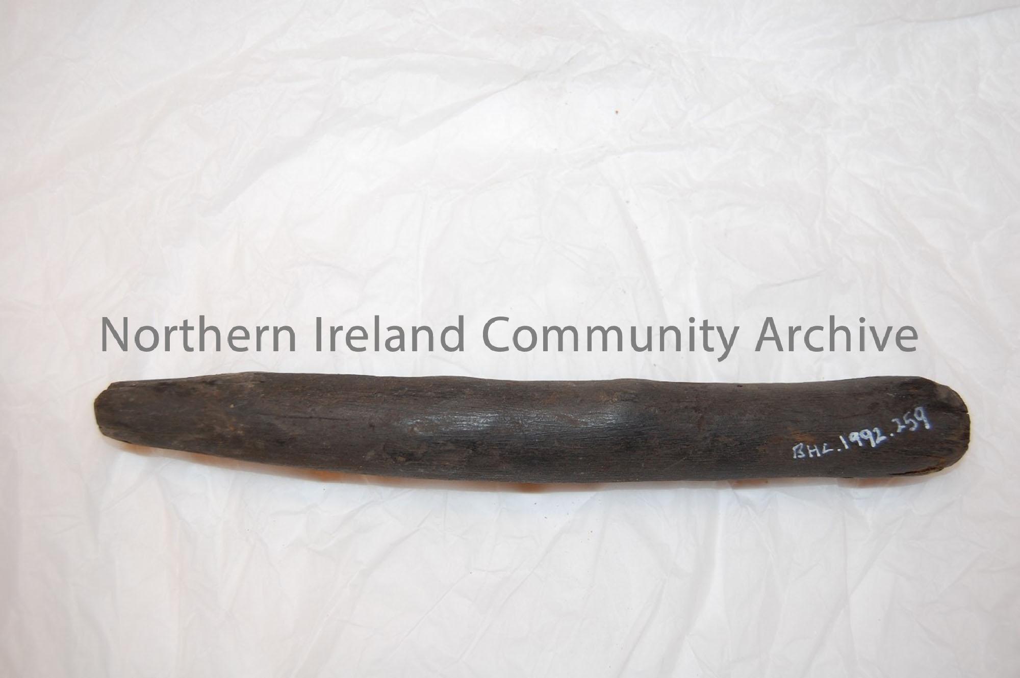 Round profiled length of wood,one end rounded and break at other end.