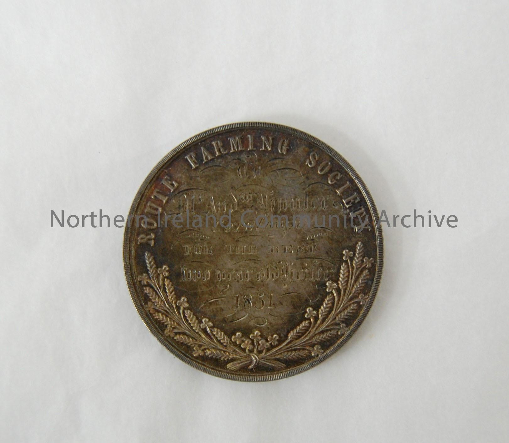 Route Farming Society medal. Awarded to Mr. Andrew Hunter, Corstown. For the best two year old heifer, 1851. Inset in wooden box with red felt. – 2007.8 (2)