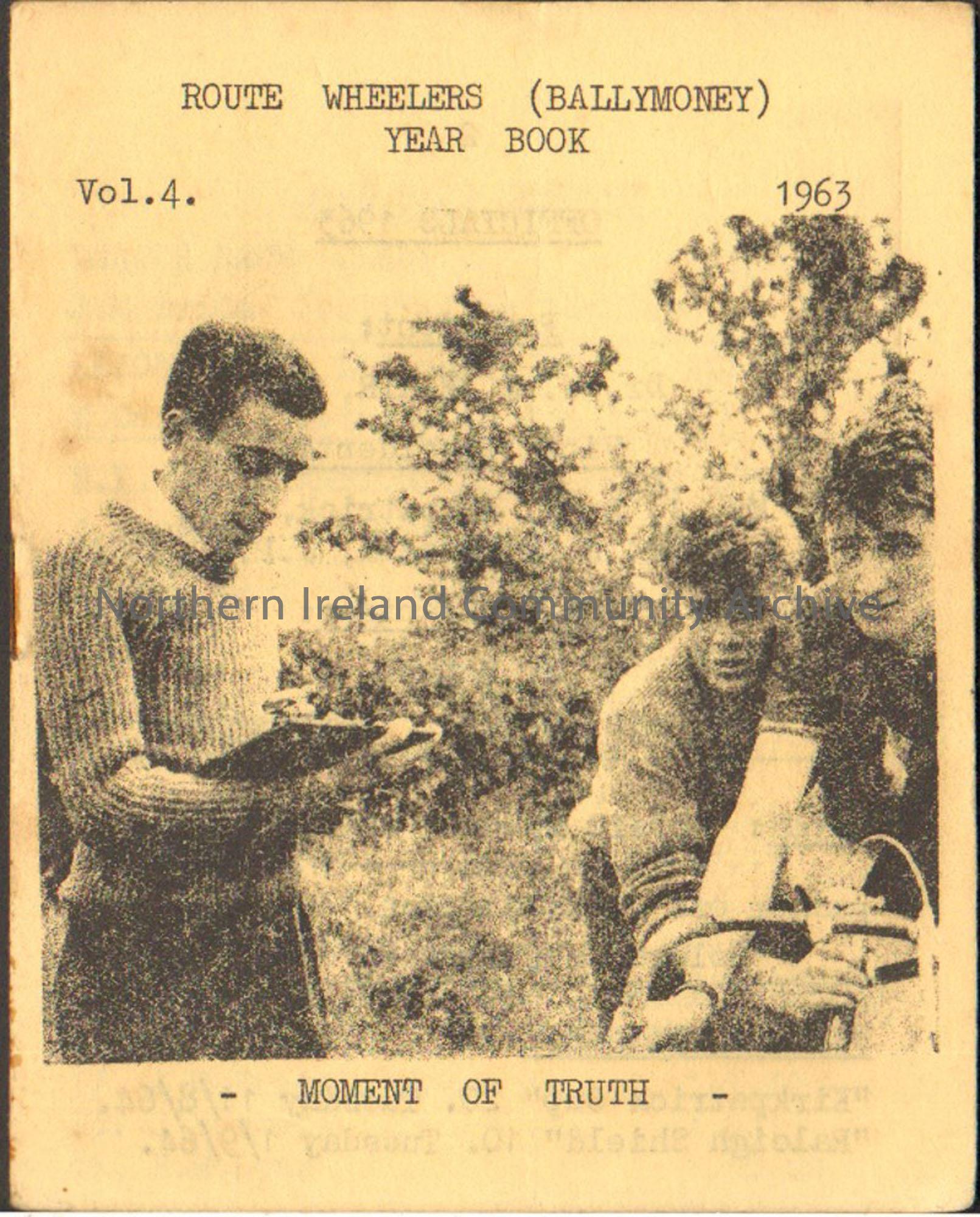 Route Wheelers (Ballymoney) Year Book Vol. 4 1963. Light orange booklet with black and white photograph of Wallace McNaul with a clip board and two cyclists on the front.