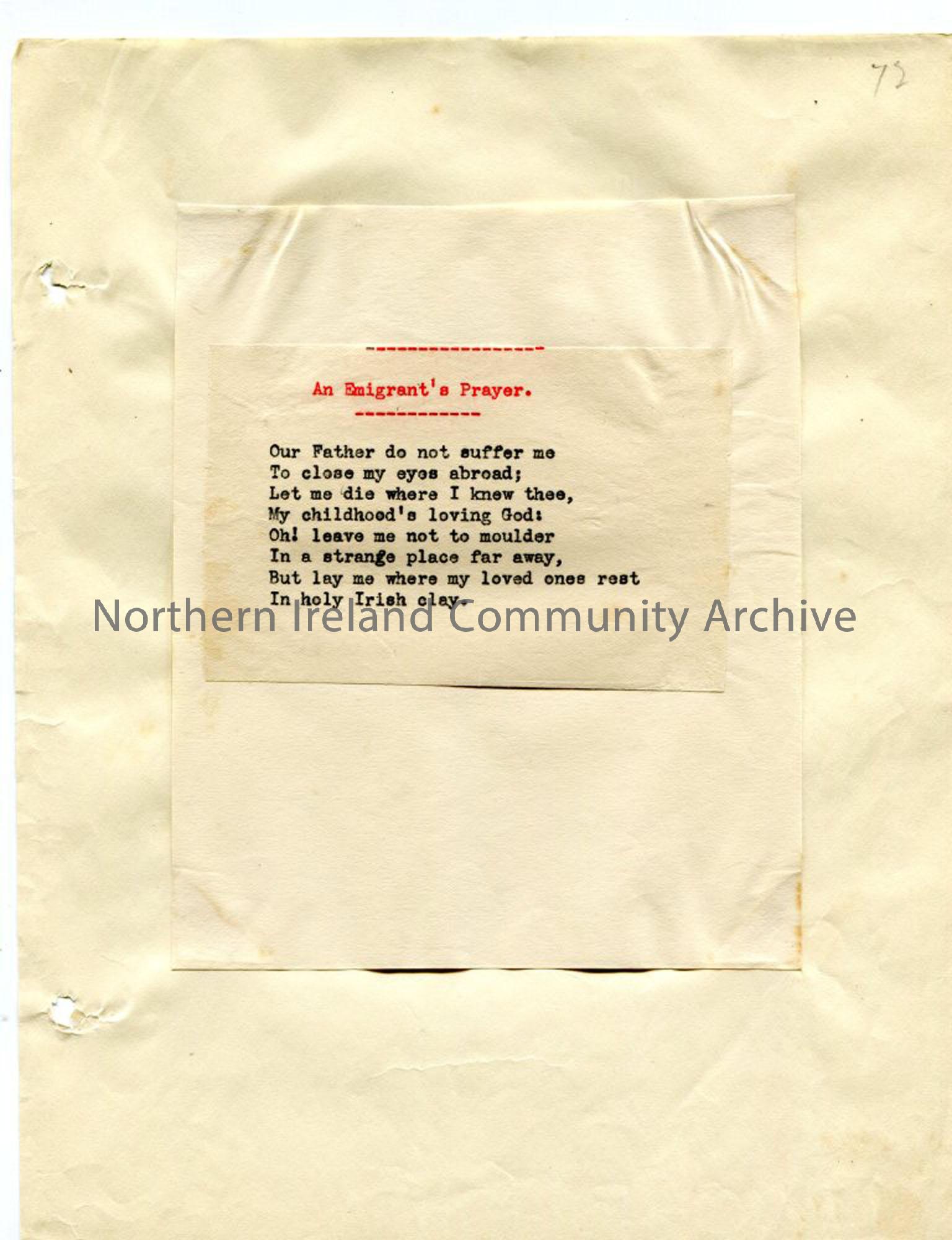 Typed words to 'An Emigrant's prayer'. Page from loose manuscript of Rowlock Rhymes and Songs of Exile- a book of verse edited by Sam Henry. The author, Robert McMullan from Portballintrae, had the pen name 'North Antrim' and was "imbued with the Celtic spirit" and interested in the fishermen of the north coast of Antrim