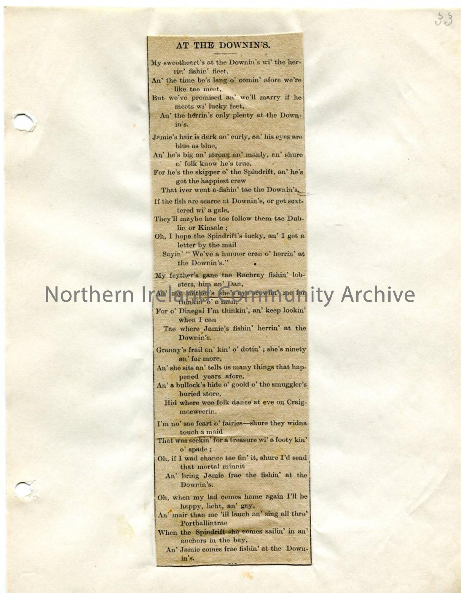 Typed words to 'At the Downins' affixed to page. Appears to be newspaper cutting. Uses local dialect. Mentions Rachray (Rathlin) and Portballintrae. Can see writing ?by Sam Henry through page on reverse of poem. Page from loose manuscript of Rowlock Rhymes and Songs of Exile- a book of verse edited by Sam Henry. The author, Robert McMullan from Portballintrae, had the pen name 'North Antrim' and was "imbued with the Celtic spirit" and interested in the fishermen of the north coast of Antrim