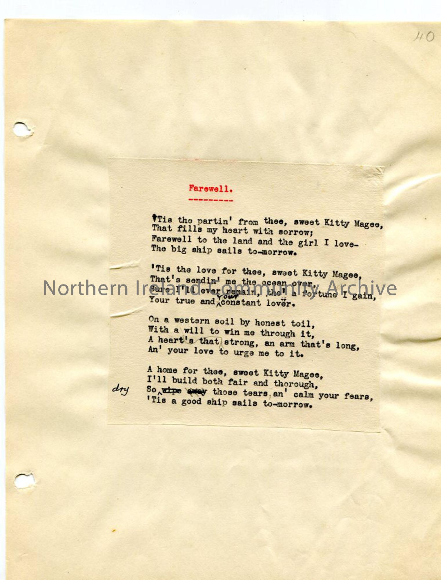 Typed words to 'Farewell' affixed to page, with handwritten corrections. Page from loose manuscript of Rowlock Rhymes and Songs of Exile- a book of verse edited by Sam Henry. The author, Robert McMullan from Portballintrae, had the pen name 'North Antrim' and was "imbued with the Celtic spirit" and interested in the fishermen of the north coast of Antrim