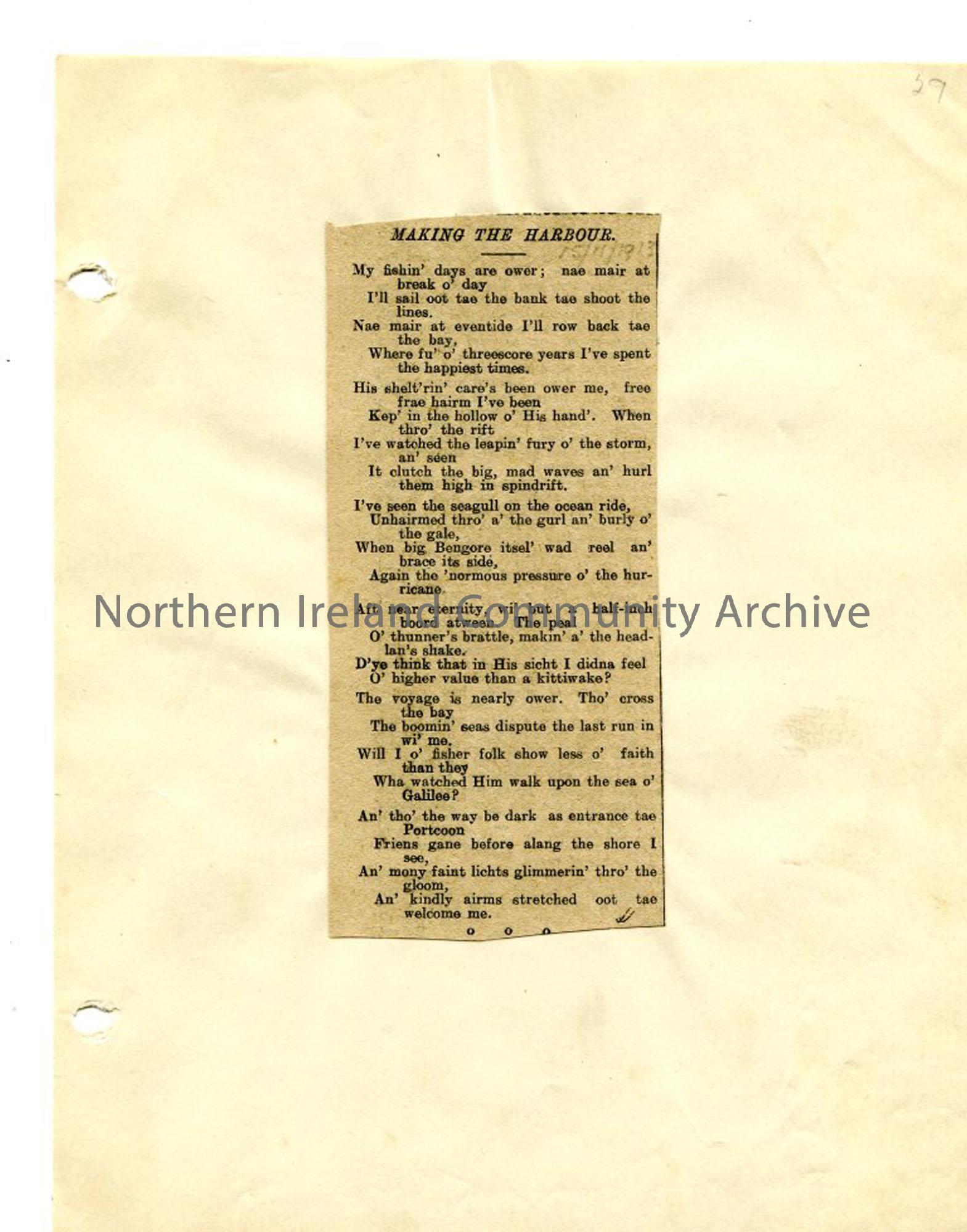 Typed words to 'Making the Harbour' affixed to page - appears to be cut from newspaper. Uses local dialect. Mentions Portcoon. Page from loose manuscript of Rowlock Rhymes and Songs of Exile- a book of verse edited by Sam Henry. The author, Robert McMullan from Portballintrae, had the pen name 'North Antrim' and was "imbued with the Celtic spirit" and interested in the fishermen of the north coast of Antrim