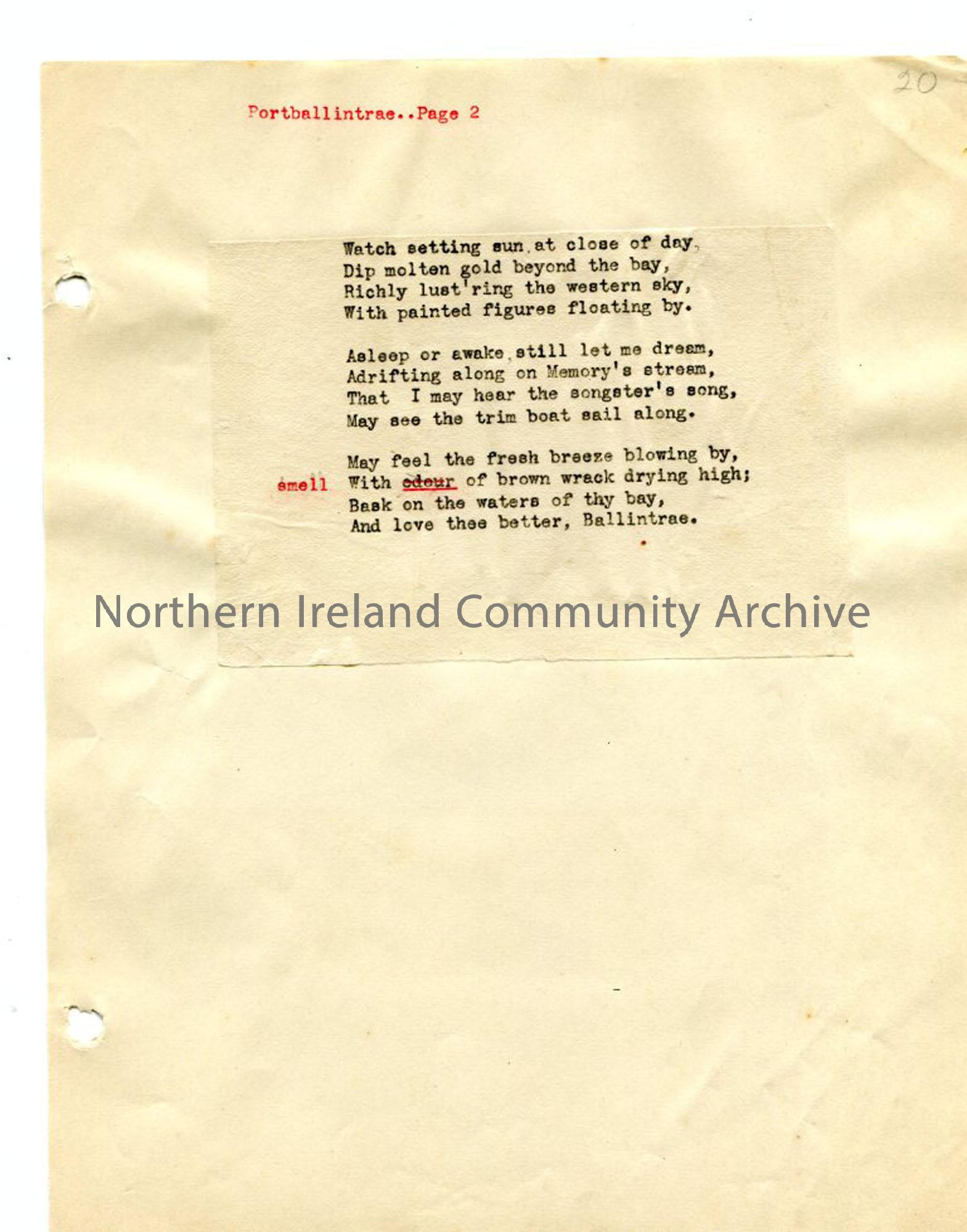 Typed page 2 of 'Portballintrae' - affixed to page. Page from loose manuscript of Rowlock Rhymes and Songs of Exile- a book of verse edited by Sam Henry. The author, Robert McMullan from Portballintrae, had the pen name 'North Antrim' and was "imbued with the Celtic spirit" and interested in the fishermen of the north coast of Antrim