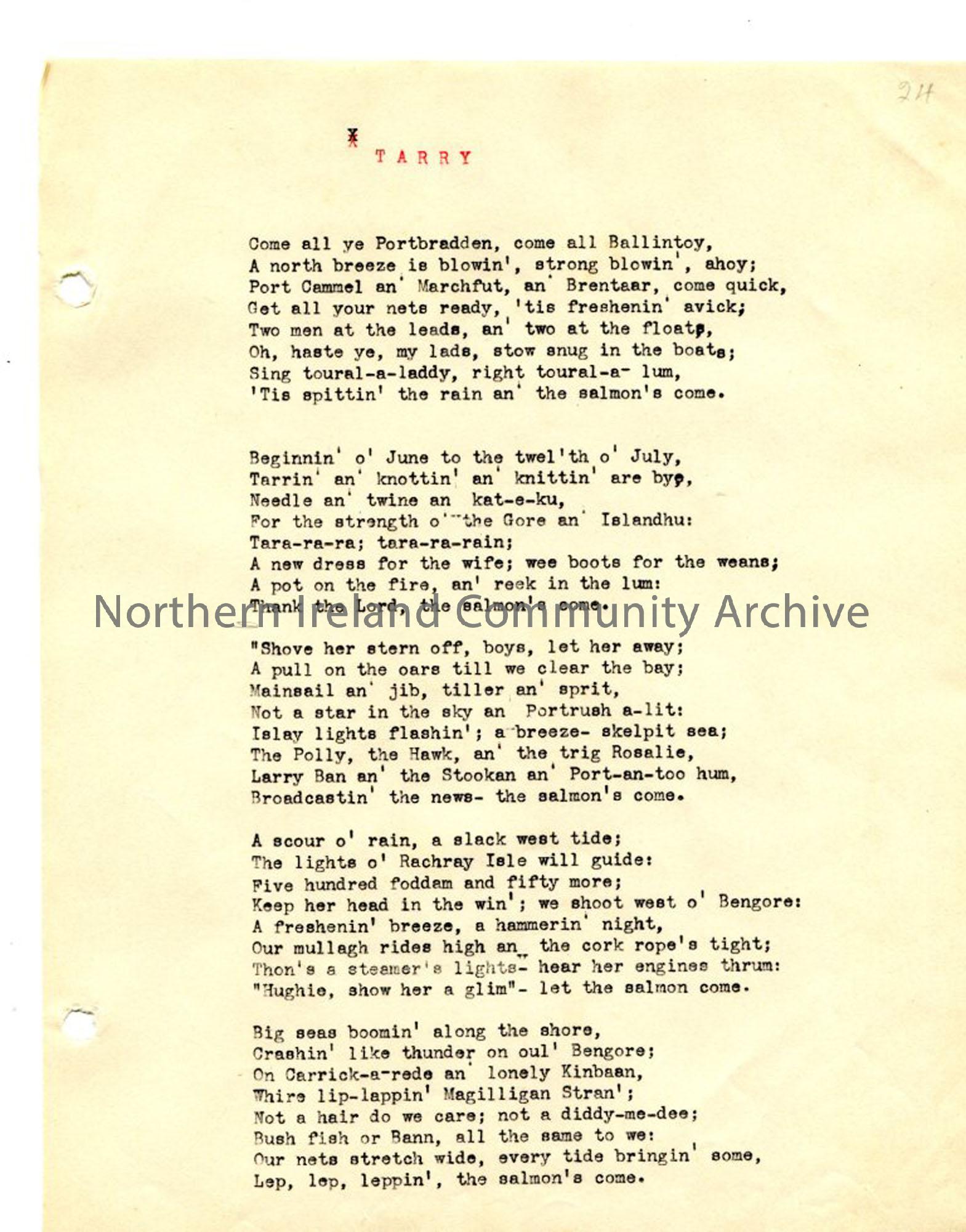 Typed page 1 of poem 'Tarry'. Uses local dialect. Mentions Portbradden, Ballintoy, Portrush, Rachry (Rathlin), Carrick-a-rede, Magilligan, River Bann. Page from loose manuscript of Rowlock Rhymes and Songs of Exile- a book of verse edited by Sam Henry. The author had the pen name 'North Antrim' and was "imbued with the Celtic spirit" and interested in the fishermen of the north coast of Antrim