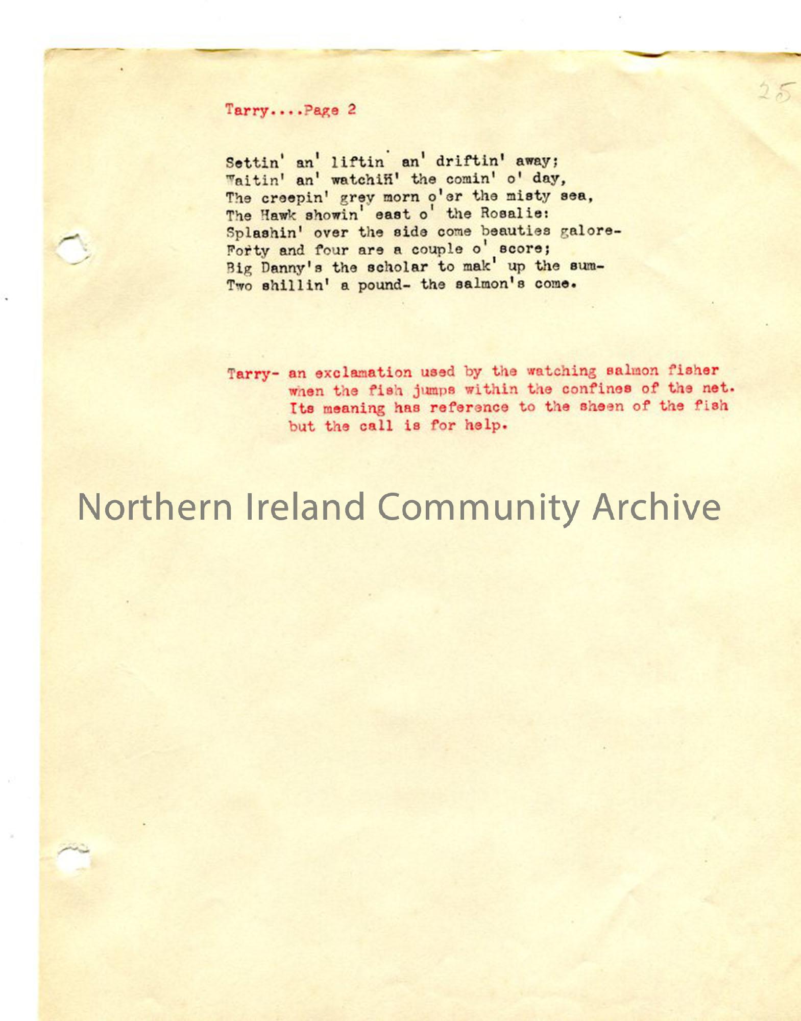 Typed page 2 of poem 'Tarry'. Uses local dialect. Contains definition of 'tarry'. Mentions Portbradden, Ballintoy, Portrush, Rachry (Rathlin), Carrick-a-rede, Magilligan, River Bann. Page from loose manuscript of Rowlock Rhymes and Songs of Exile- a book of verse edited by Sam Henry. The author, Robert McMullan from Portballintrae, had the pen name 'North Antrim' and was "imbued with the Celtic spirit" and interested in the fishermen of the north coast of Antrim