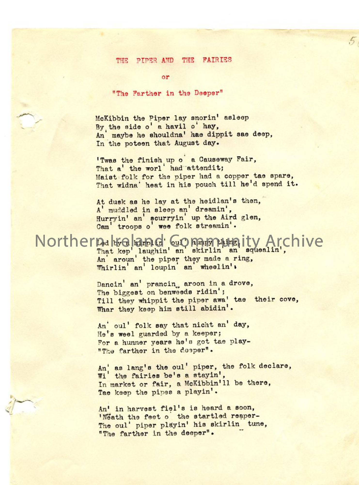 Typed words to - 'The Piper and the Fairies' (added title - 'The Farther in the Deeper'). Uses local dialect. Mentions Causeway Fair. Page from loose manuscript of Rowlock Rhymes and Songs of Exile- a book of verse edited by Sam Henry. The author, Robert McMullan from Portballintrae, had the pen name 'North Antrim' and was "imbued with the Celtic spirit" and interested in the fishermen of the north coast of Antrim