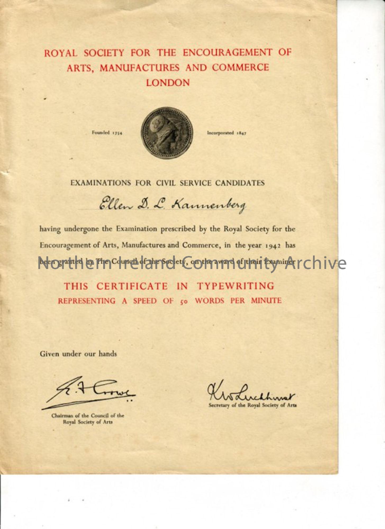 Royal Society for the Encouragement of Arts, Manufacturers and Commerce London, examinations for civil service candidates Ellen D.L.Kannenberg. Certificate is in typewriting representing a speed of 50 words per minute.