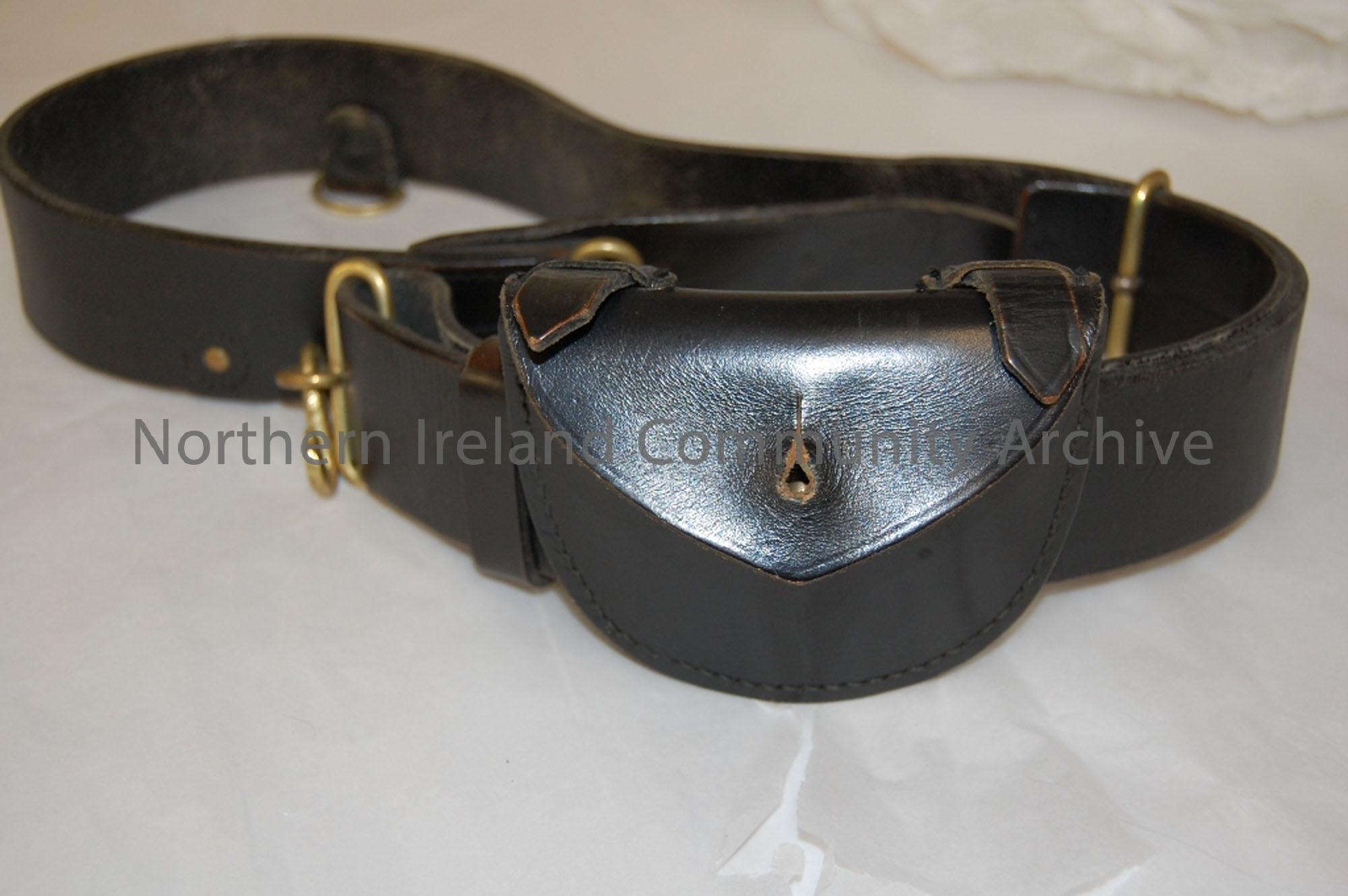 RUC circa 1940-60. See also BHC:1998.199 and 201. Black leather with brass snake fastener. Stamped ‘ Hobson and son 19-9, (London) Ltd