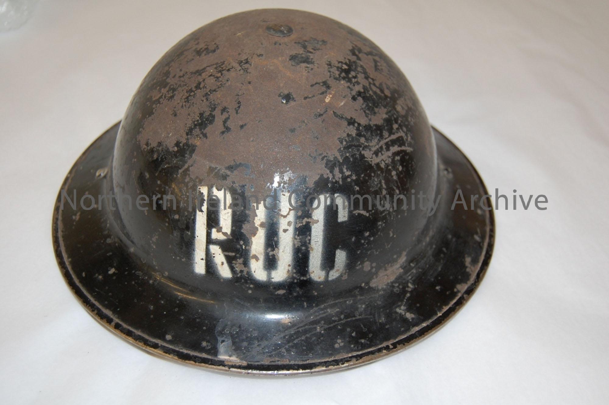 RUC circa 1940’s; Black with the letters ‘RUC’ painted on front. Inner padding still intact with strap. Some of black paint chipped off. See BHC:1998….