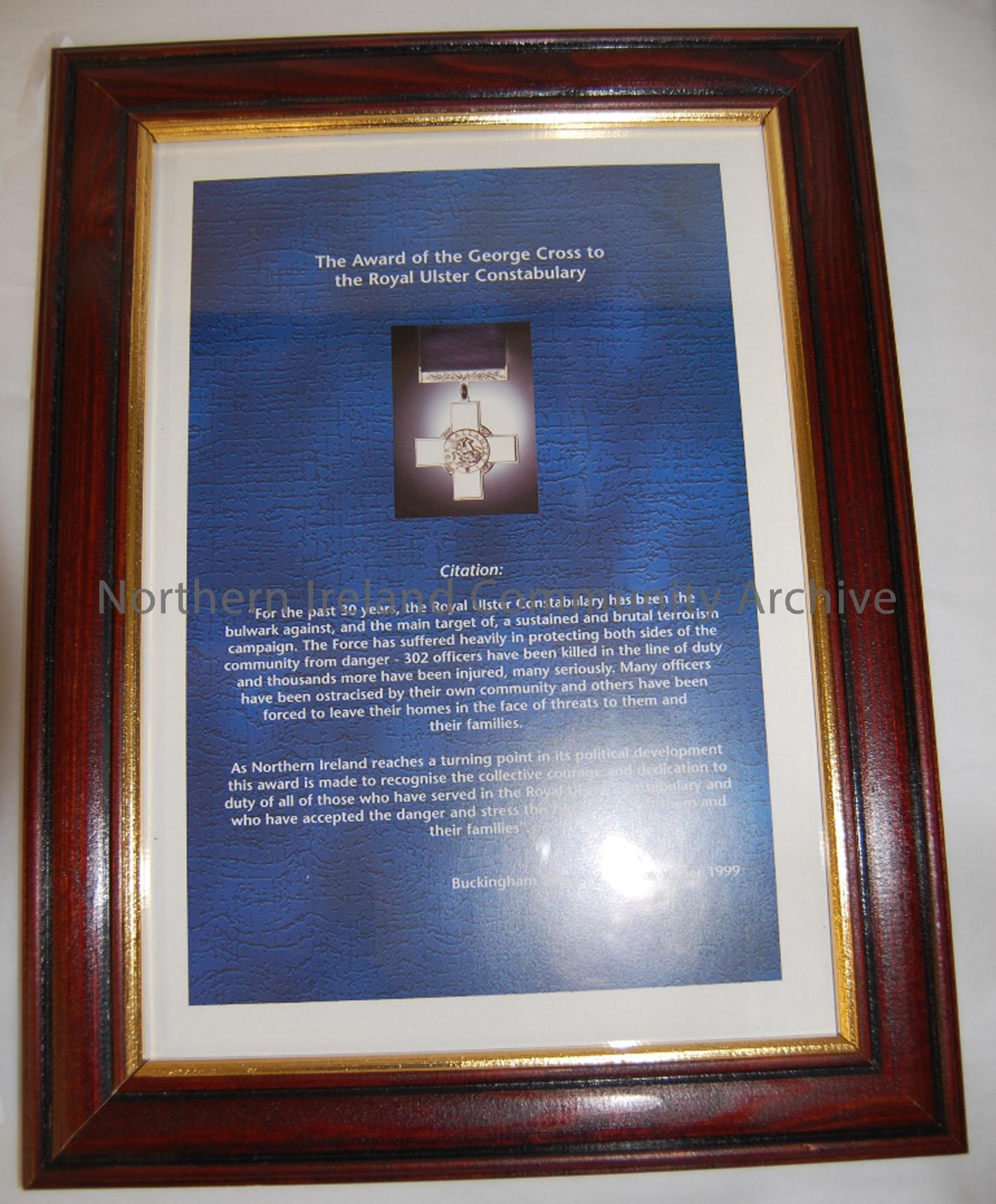 RUC citation for George Cross medal & VHS video or ceremony, 1999