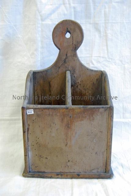 The Salt Box was kept near the fireplace to keep salt dry. Sometimes a box of this shape was used for knives, forks and spoons. Courtesy of Ballycastle Museum.