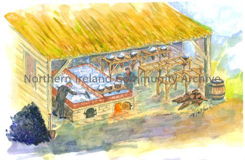Illustration of a typical 18th century saltworks, similar to that which operated in Ballycastle, by Danny McGill