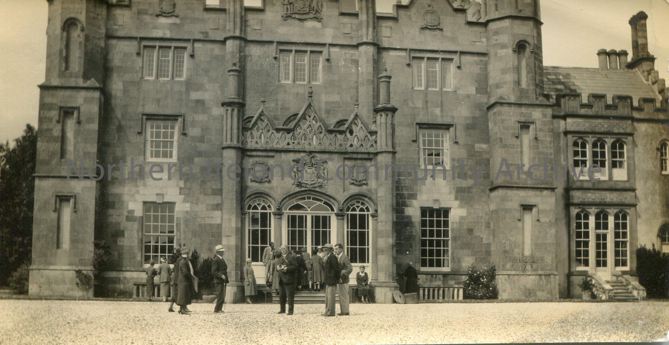 Sam Henry, centre, as part of a group, in front of a large stone building – house or castle?