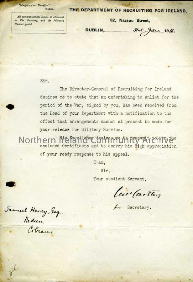 There was a rush to join up and serve. There was a sense of duty and for some - adventure. However there were rejections. Sam Henry was rejected on the grounds that his occupation as a Customs and Excise Officer was considered an essential service.
