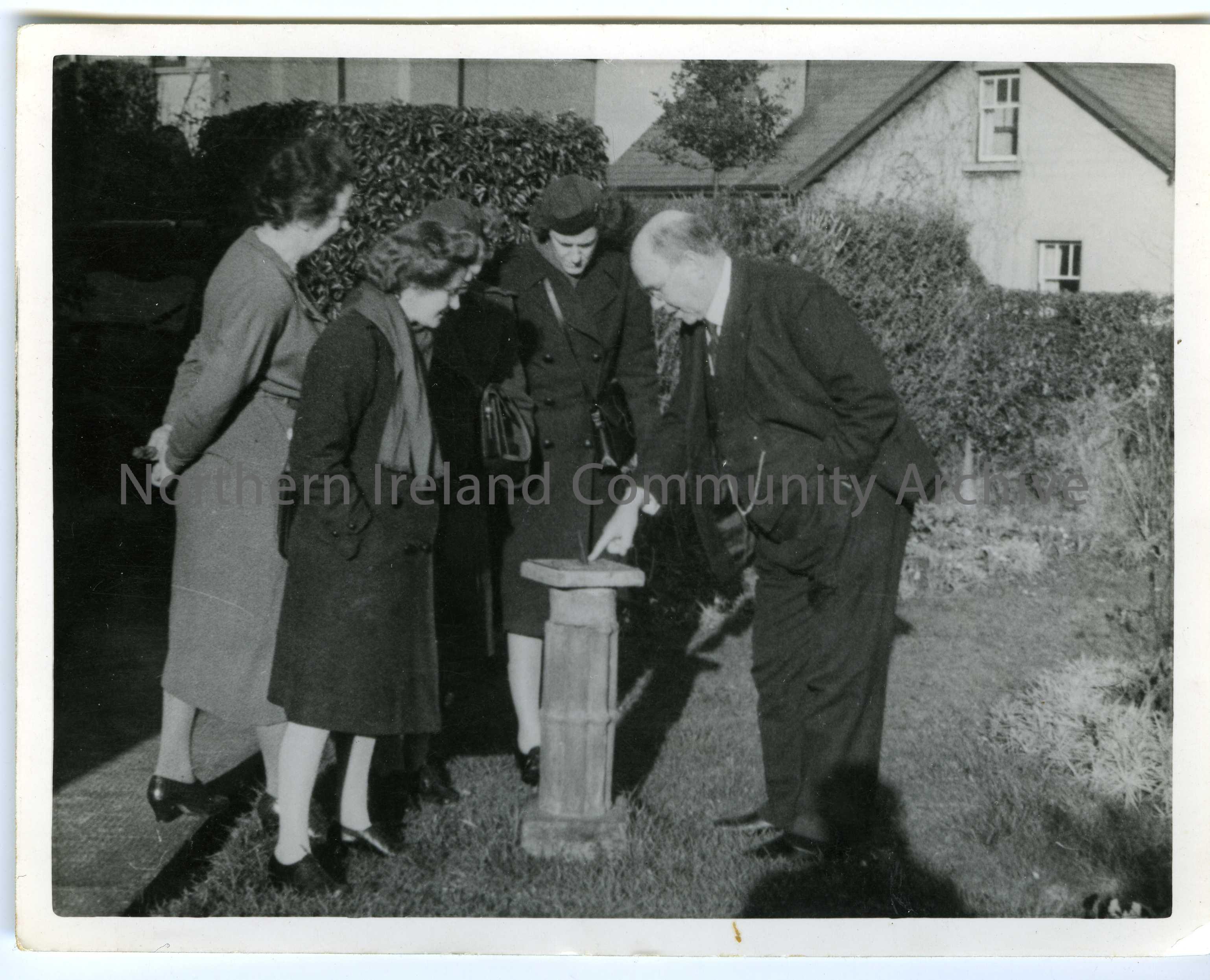 Sam Henry (far right) and Maimie Henry (far left) standing with three women around a sun dial in a garden.