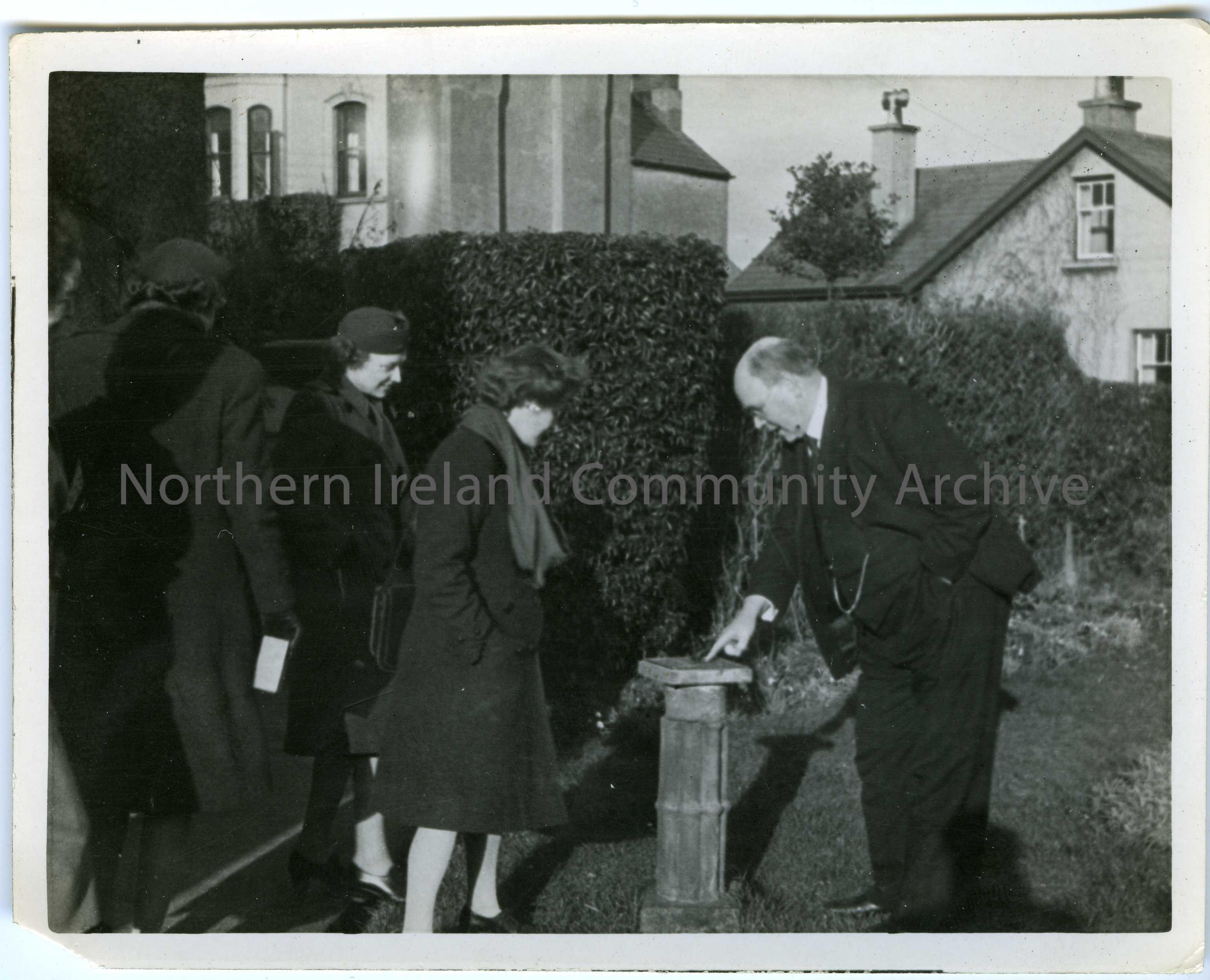 Sam Henry (far right) in a garden pointing to a sundial in front of him. Group of women are standing to the left.