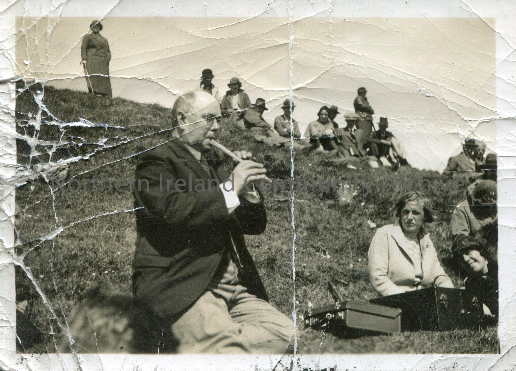 Sam Henry playing the tin whistle on a grassy hill surrounded by other adults.