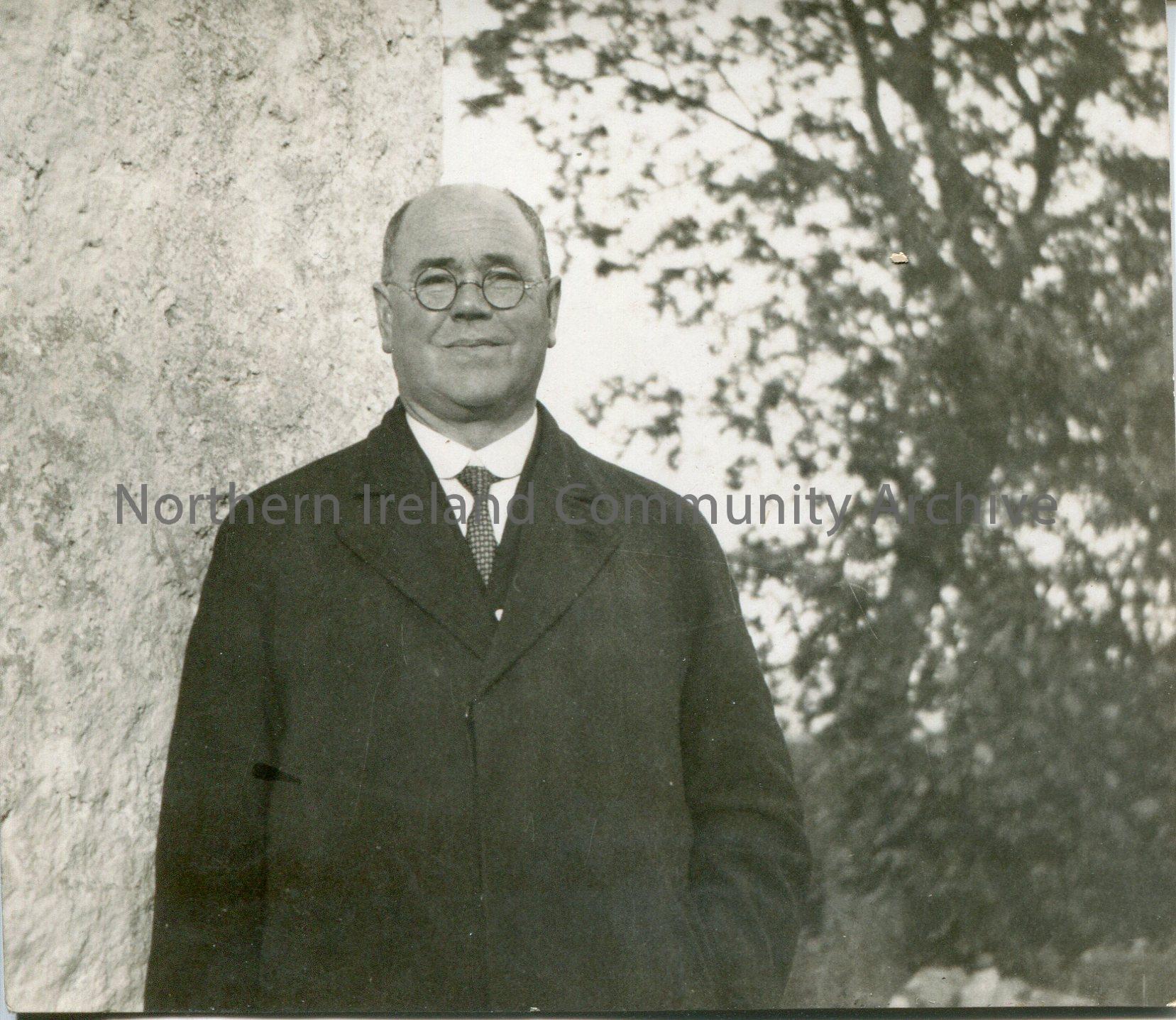 Sam Henry standing beside a wall. Handwritten on reverse, ‘Ballyliffin. Mrs Crozier, 3 University Square’.