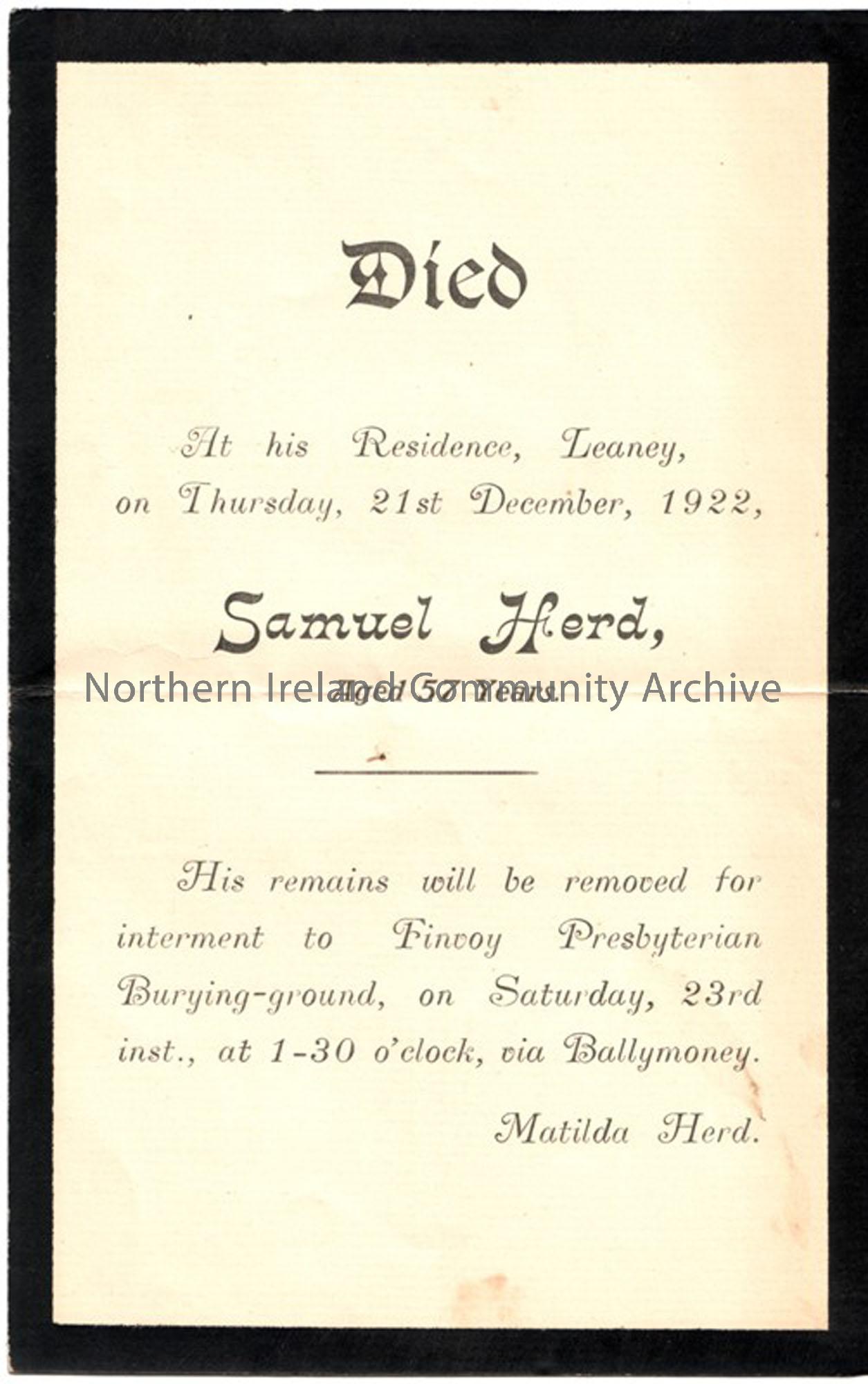 Samuel Herd of Leaney, buried in Finvoy Presbyterian Burial Ground d. 21st December 1921, aged 38 years