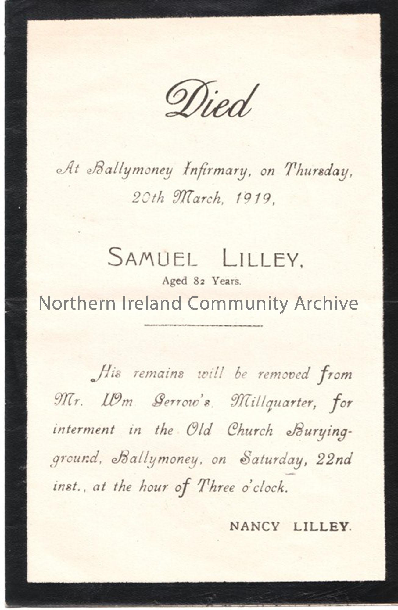 Samuel Lilley buried in Old Church Burying Ground, Ballymoney d. 20th March 1919, 82 years