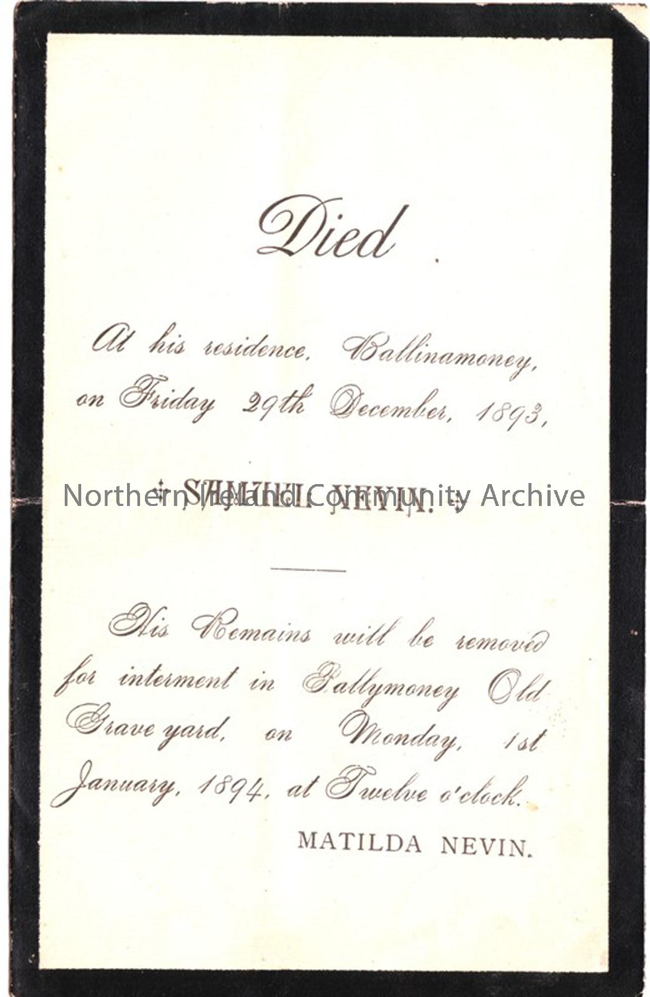 Samuel Nevin of Ballinamoney, buried in Ballymoney Old Graveyard d.9th Dec 1893