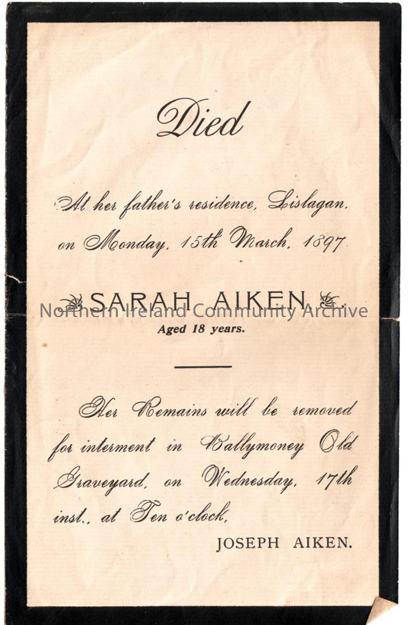 Sarah Aiken of Lislagan, buried in Ballymoney Old Graveyard d.15th March 1897, aged 18 years