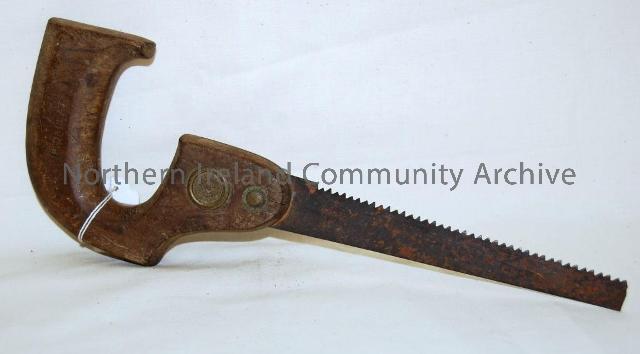 Wood saw - Keyhole type with hook handle, named P. Dallat on handle - ie local use in Ballycastle. Courtesy of Ballycastle Museum.