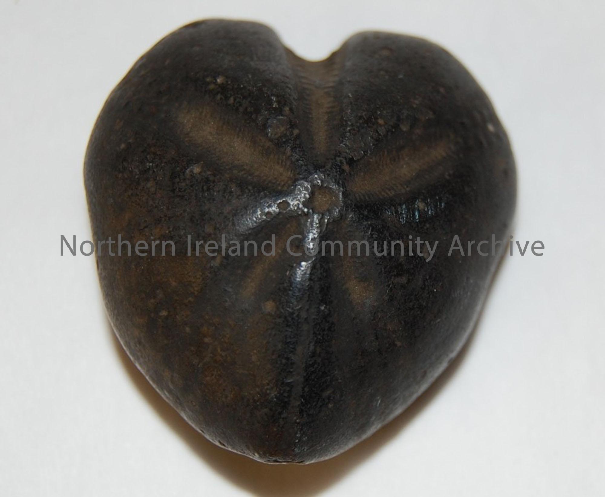 sea urchin,black, heart shaped:six toothed indentations on top, extending in star shape.
