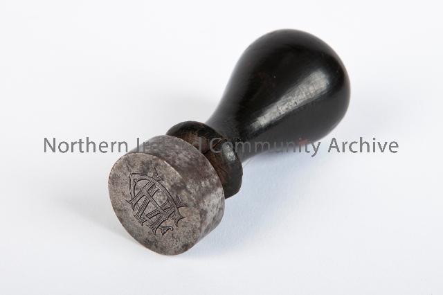 Round metal seal with the initials H.A.G intertwined. Black wooden handle. Courtesy of Coleraine Museum.