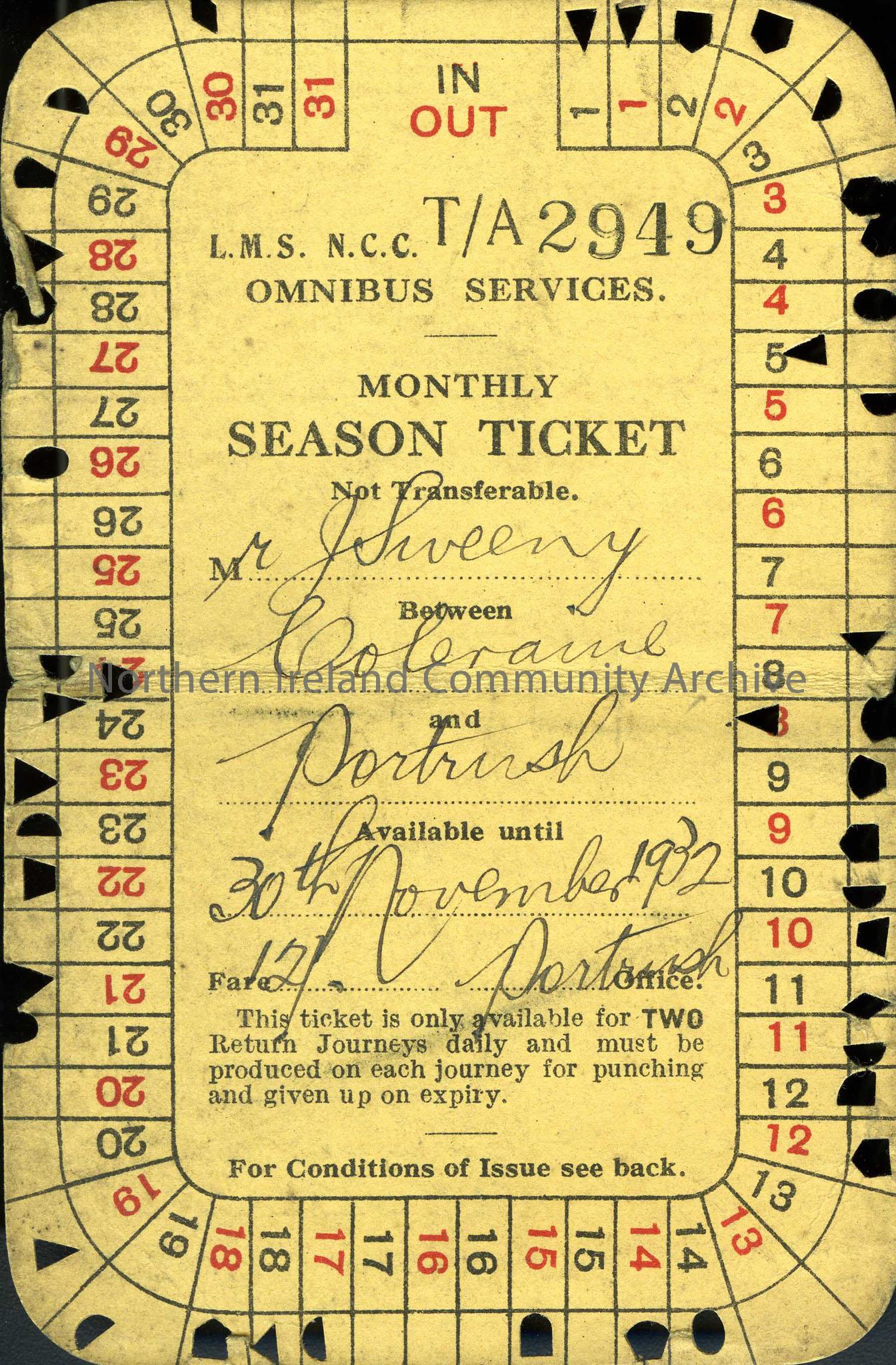 Season ticket for LMS N.C.C. Omnibus services belonging to Mr Sweeney. For between Coleraine and Portrush. Available until 30th November 1932 and valid for two return journeys daily. Edges are punched for journeys by date. Conditions listed on the back.
