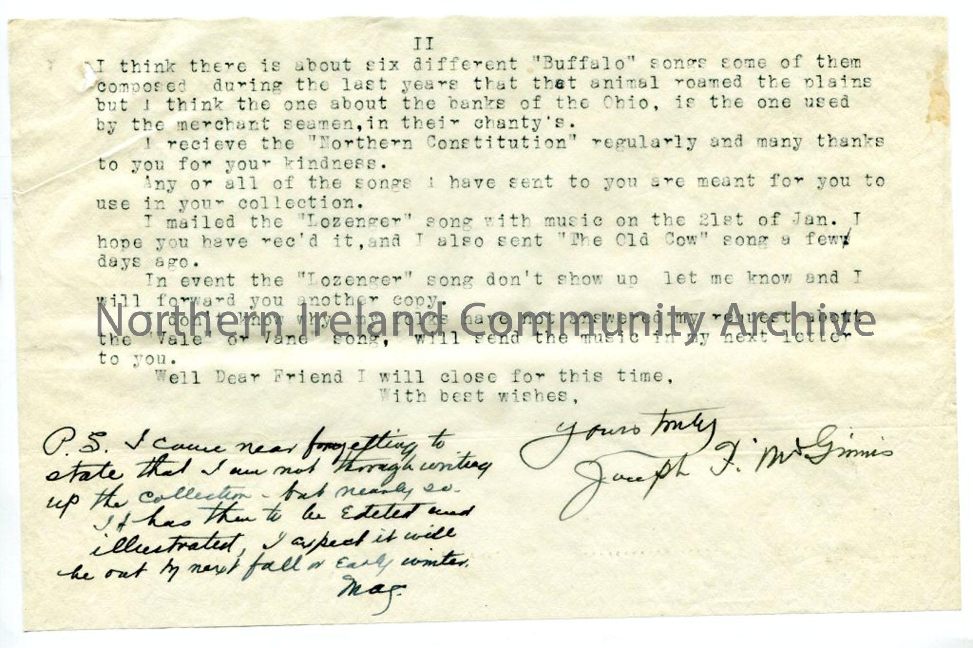Second page of latter regarding exchange of songs, books etc, with handwritten note at end to say Joseph is nearly finished writing his collection. One of a bundle of documents pinned together, from Joseph McGinnis, who had a keen interest in songs sung by sailors.