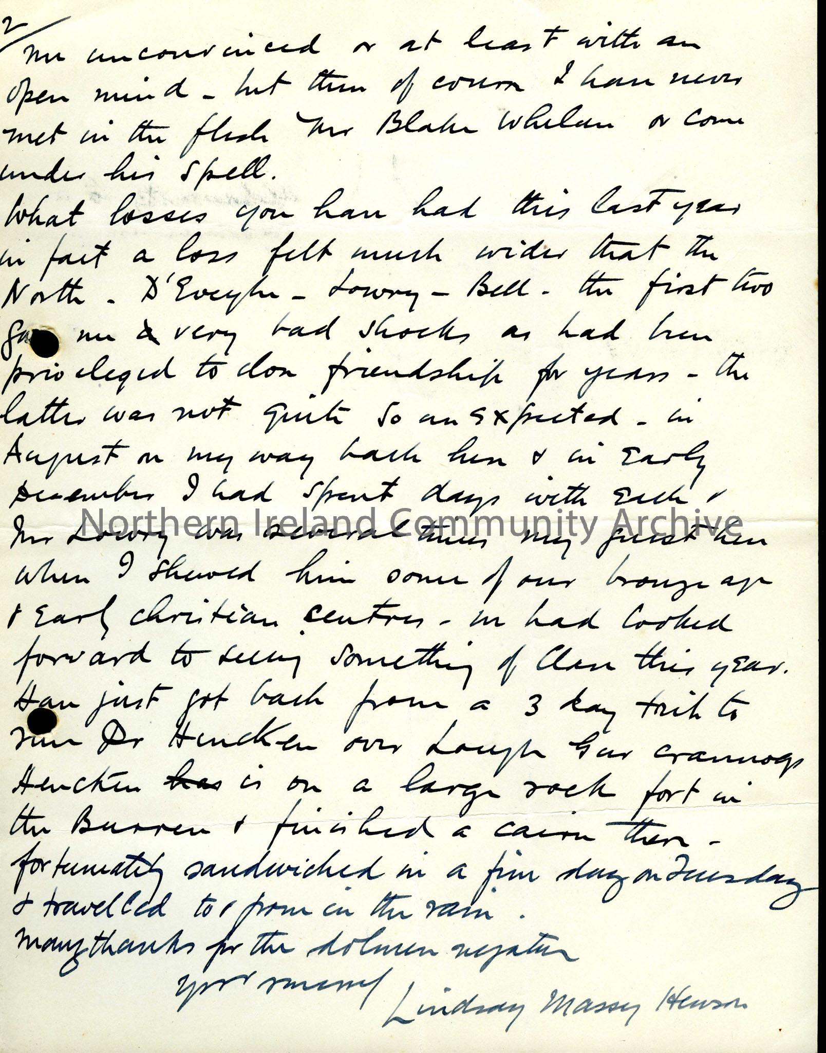 Second page of a letter from Rev. Lindsay Massey Hewson. He mentions common acquaintances who have died that year: D’Eveyln,; Lowry and Bell.