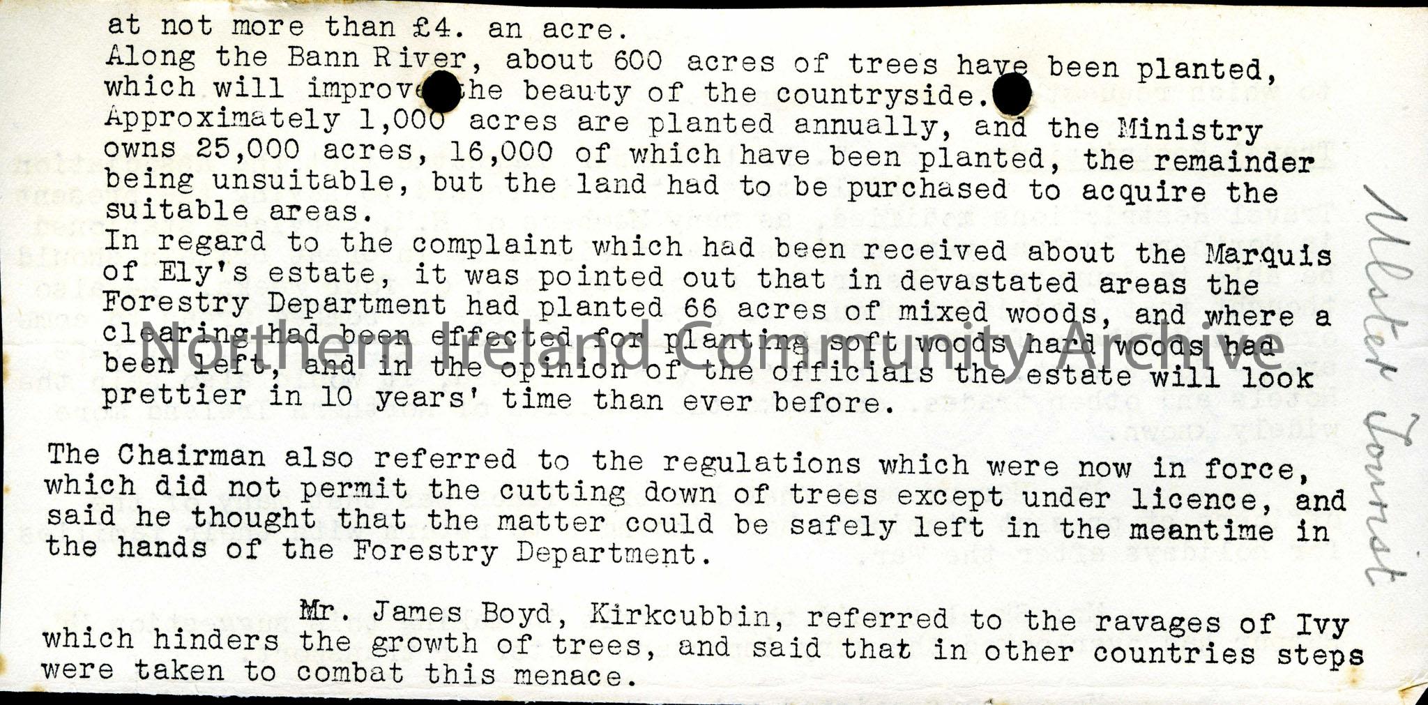 Second page of notes about the cutting down of trees in Ulster. This states that 600 acres of trees have been planted along the Bann and that the Mini… – Scan014