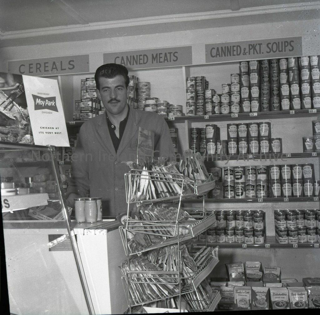 Self Service Grocery in Bushmills, Aug 1963 man behind counter