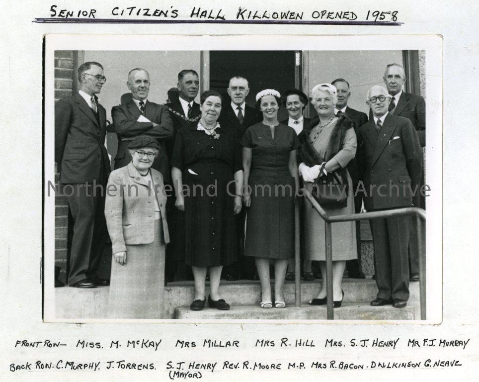 Senior Citizen's Hall, Killowen, opened 1958: Front Row- Miss M. McKay, Mrs Millar, Mrs R. Hill, Mrs S.J. Henry, Mr F.J. Murray. Back Row- C. Murphy, J. Torrens, S.J. Henry (Mayor), Rev. R. Moore, M.P, Mrs R. Bacon, D. Wilkinson, G. Neave.