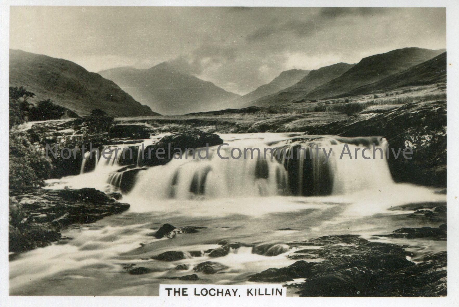 Senior Service cigarette card. Features image of a waterfall and mountains at The Lochay, Killin. On the reverse is text within a rectangle ‘Beautiful…