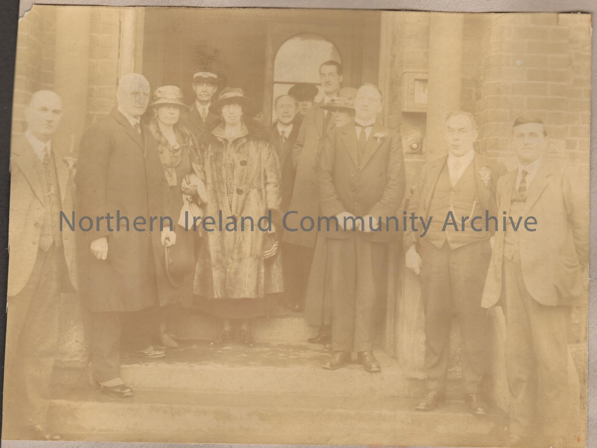 Sepia photograph of 8 men and 3 ladies on the steps outside of a doorway. Possibly Town Hall?
