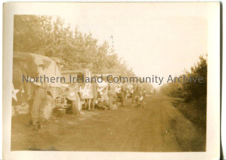 Sepia photograph of army vehicles parked on the side of road. Road has high hedges either side. Group of men next to the vehicles, one is consulting a…