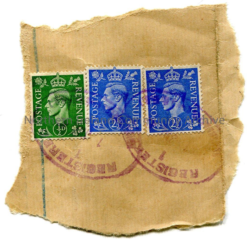 Set of three postage stamps pasted to part of a brown coloured envelope. One green stamp and two blue coloured stamps. Green stamp is a 1/2d King George VI postage stamp and the two blue stamps are 2 1/2d featuring King George VI. Two 'Registered' stamps over postage stamps.