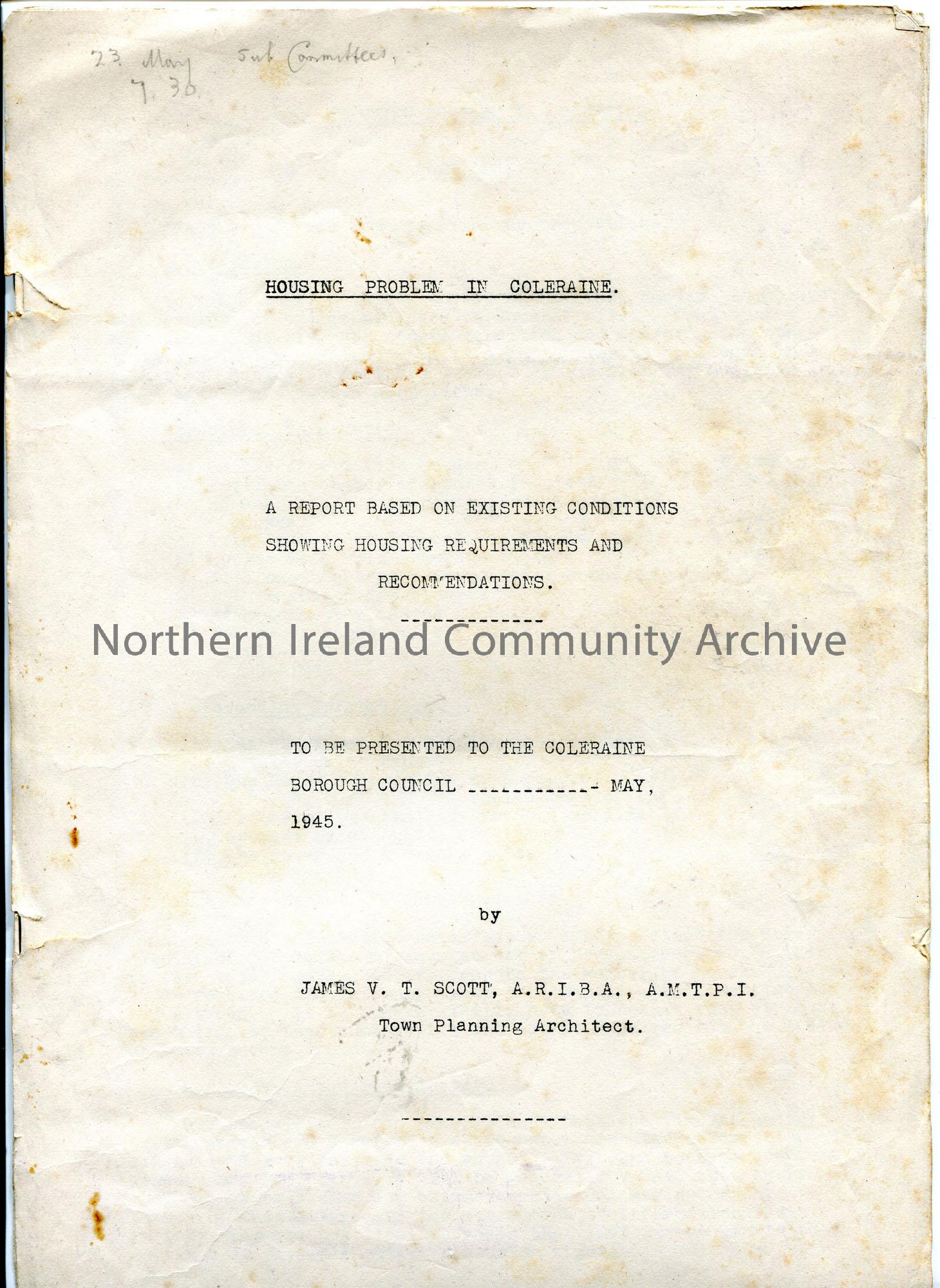 Seven page stapled booklet of the 'Housing Problem In Coleraine. A Report Based On Existing Conditions Showing Housing Requirements And Recommendations. To Be Presented To The Coleraine Borough Council---May 1945 by James V T Scott, A.R.I.B.A., A.M.T.P.I. Town Planning Architect'. '23 May sub committees 7.30' handwritten in pencil in top left corner. The new housing is proposed for the 'Calf Lane' area of Coleraine.