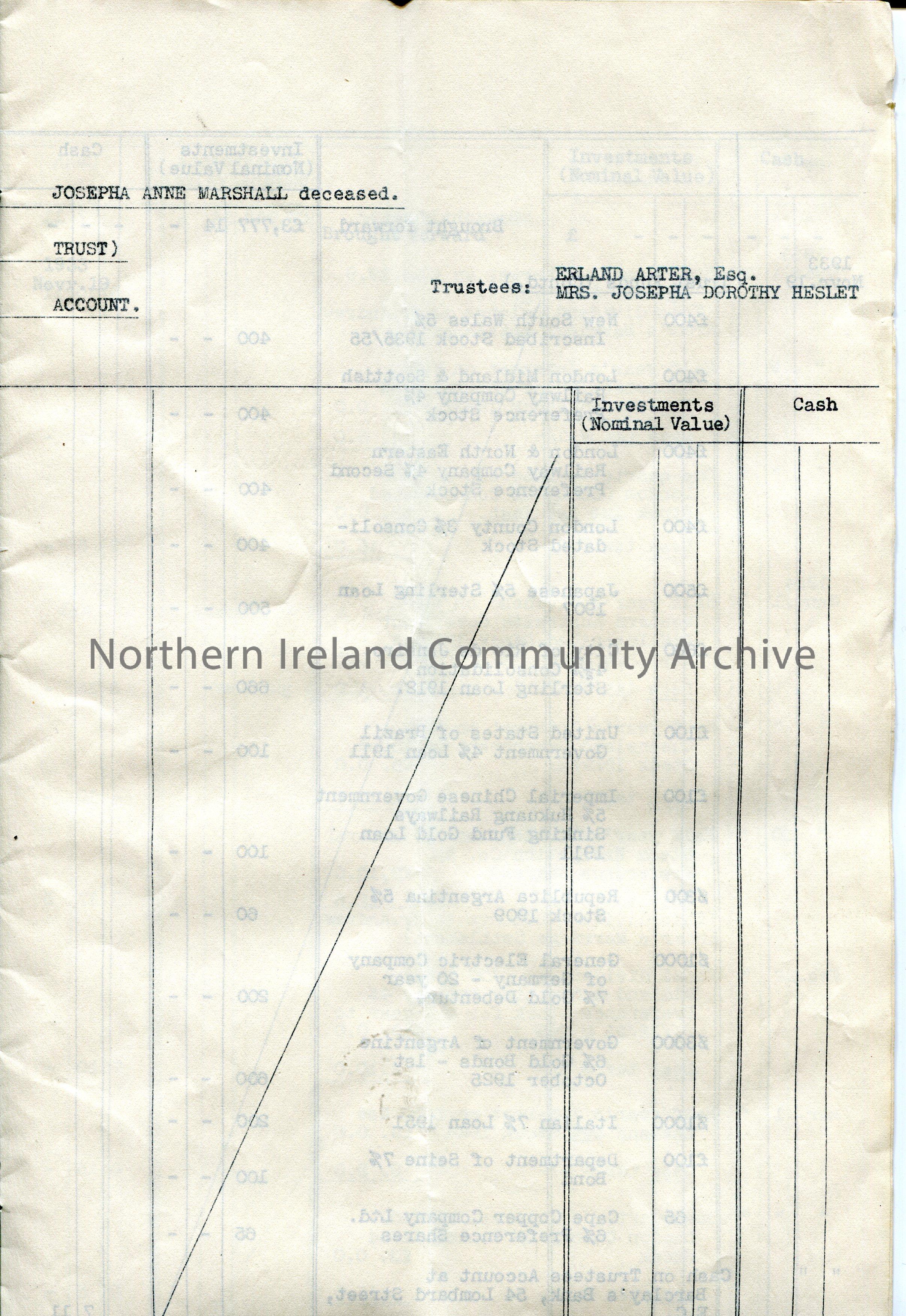 Seven pages tied together at the spine with green coloured material. The Will of Josepha Anne Marshall. Marshall Trust. Distribution Account. Dated 1935. Solicitors ? Ralph Bond Veitch & Bilney, Norfolk House, Norfolk Street, Victoria Embankment, W.C.2. Trustees of the Will named as Erland Arter and Mrs Joespha Dorothy Heslet [Hezlet]. Lists the details of the trust funds which total £37.10.11. Signed JWH [unclear].