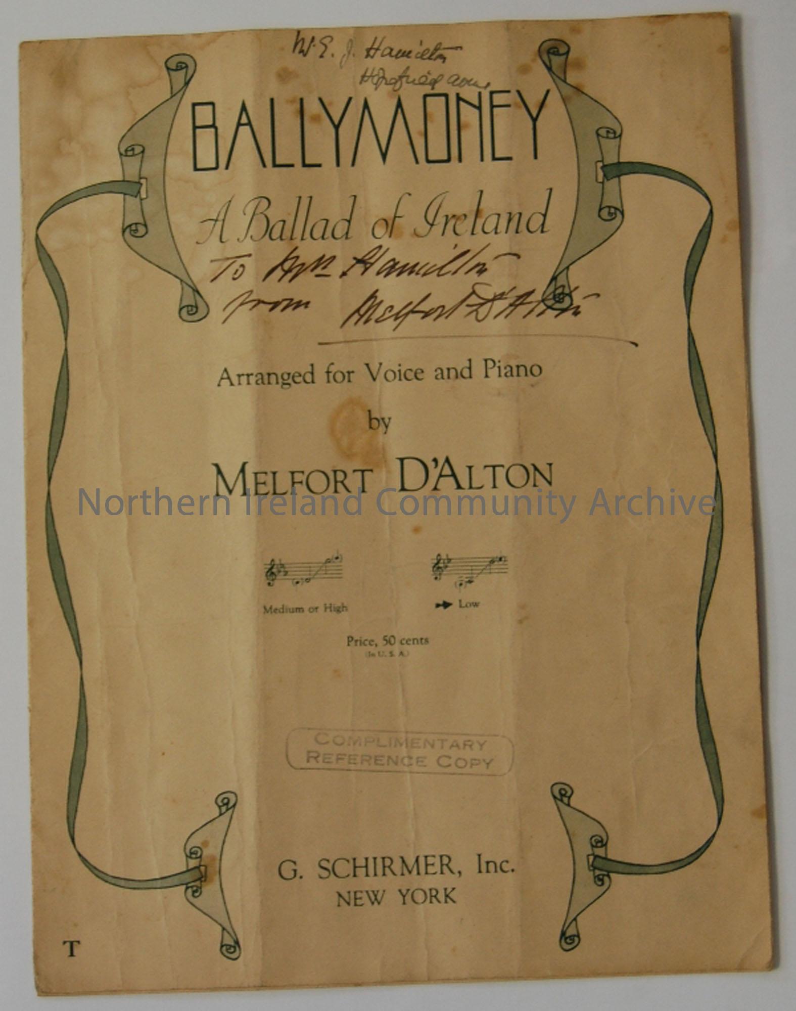 Sheet music for ‘Ballymoney: A Ballad of Ireland’ Arranged for voice & piano by Melfort D’Alton, price 50 cents.