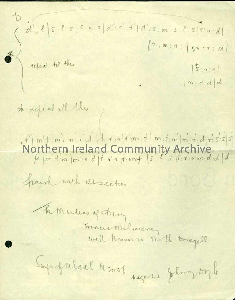 sheet of handwritten music notation, with notes at bottom - mentions Songs of Uladh.