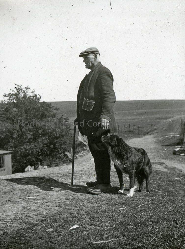Shepherd with dog in rural setting. (JM - copy in an envelope is labelled 'Dungiven, Glenshane, Banagher, Carnanban, Lignapeiste - this looks like Glenshane Pass)