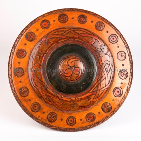 Circular wooden Shield with domed centre boss. Outer rim is decorated with a Celtic rope design in poker work. There are 17 roundels around the outside edge. The centre dome is decorated with a very old Celtic Trinity design. Courtesy of Ballycastle Museum.