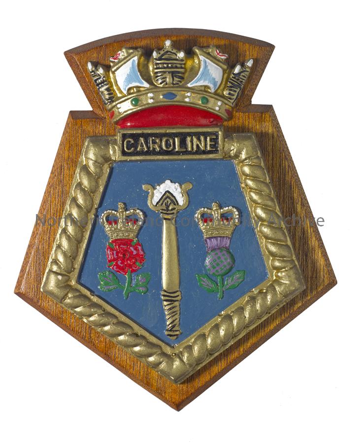 Ship's crest from HMS Caroline. Caroline was a C-class light cruiser commissioned in 1914. She saw service in the North Sea throughout WWI and took part in the Battle of Jutland, 31st May-1st June 1916.