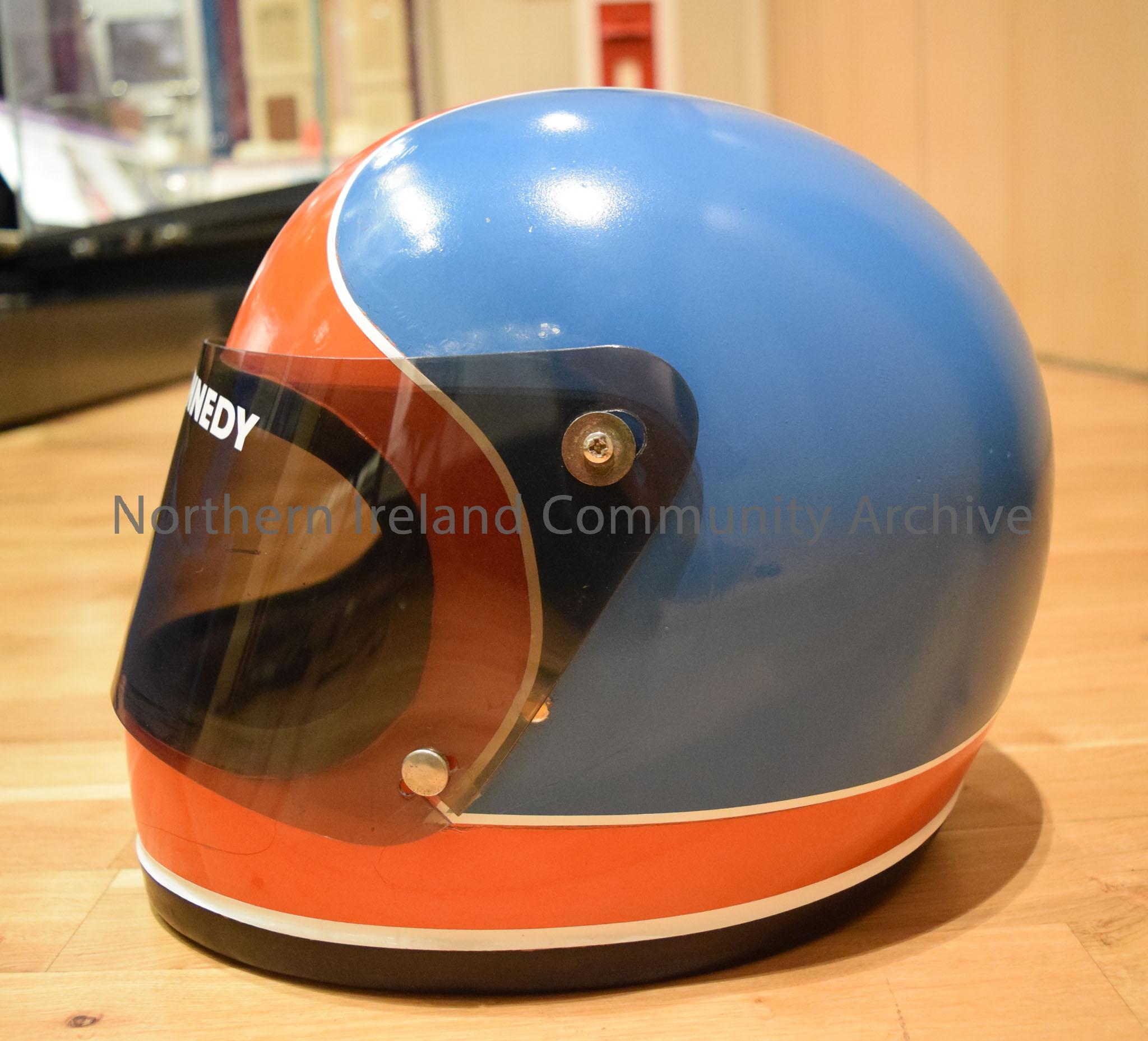 Shoei motorcycle helmet belonging to Frank Kennedy. Blue helmet with red front and red stripe down the middle with a white border- cracked – 2016.109 (3)