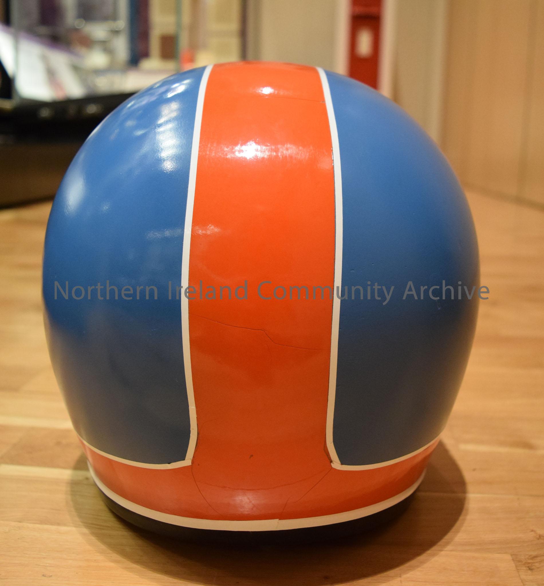 Shoei motorcycle helmet belonging to Frank Kennedy. Blue helmet with red front and red stripe down the middle with a white border- cracked – 2016.109 (4)