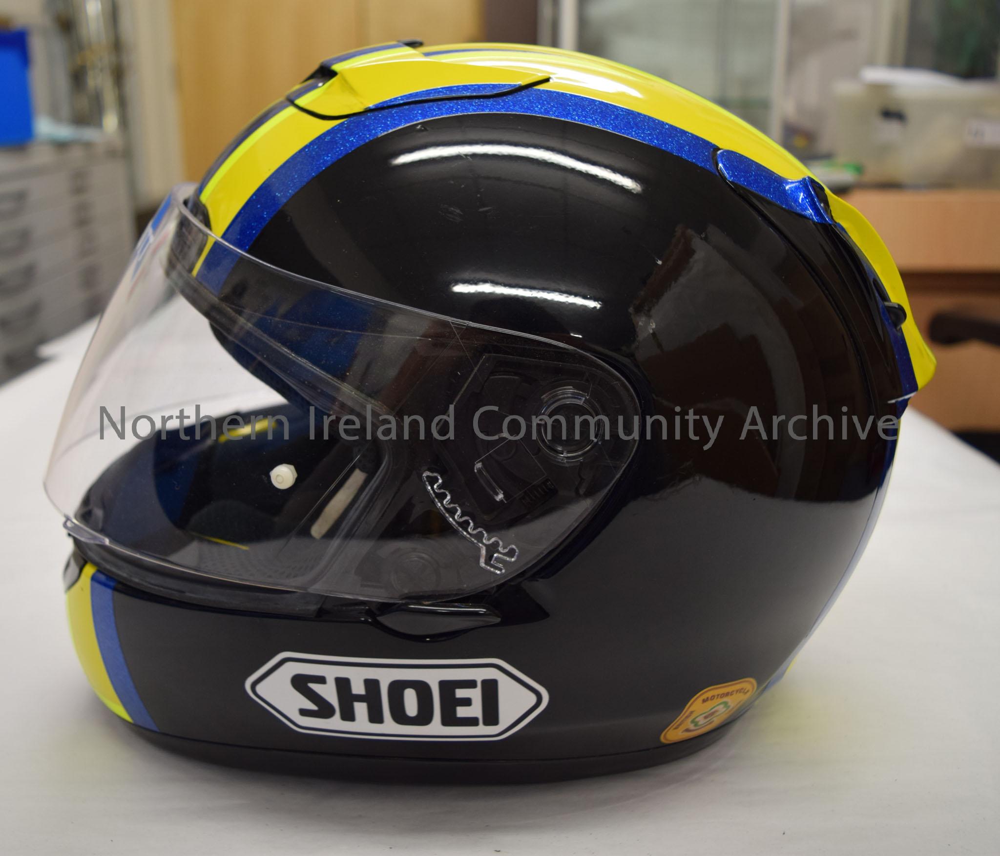 Shoei motorcycle helmet belonging to Marty Nutt. Black helmet with a yellow, fluorescent yellow and sparkly blue “M” pattern on the top. – 2016.84 (3)